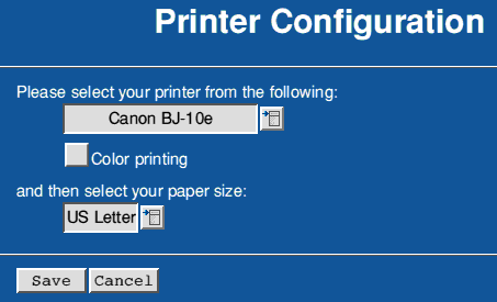 The printer window will allow users to configure their NC for the printer they have attached. On clicking the printer icon the main frame will display a HTML page similar to this: