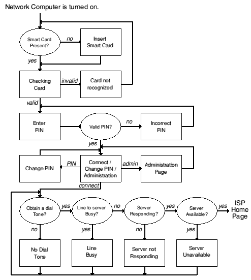 The following diagram illustrates the typical processes to be completed from the initial turning on of the Network Computer to the displaying of the ISP home page on modem based machines.